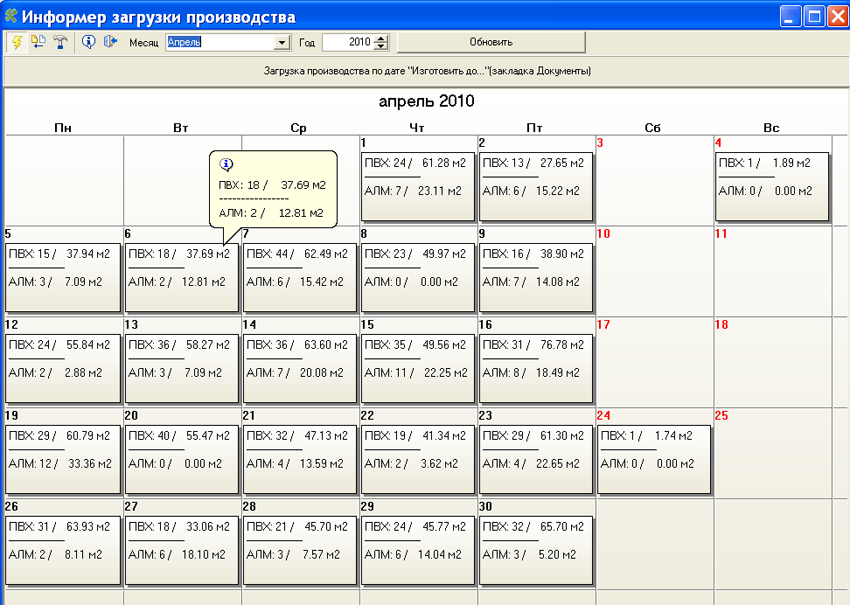 Программа предназначена для оперативного предоставления информации о загрузки производства изделиями по датам (на выбор “Дата завершения” или “Дата Срок до…”). Данные распределяются по двум типам проф.систем ПВХ и Алюминий.